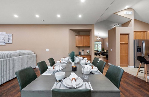 For those who love to cook, the gourmet kitchen at Mirage Peak Manor is a dream come true. Fully equipped with state-of-the-art stainless steel appliances, including a refrigerator-freezer, oven, stovetop, microwave, and dishwasher, this kitchen has everything you need to prepare delicious meals. Imagine starting your day with a freshly brewed cup of coffee from the Keurig machine, enjoying the variety of K-cups provided. The Ninja blender, four-slice toaster, beautiful dishes, expansive glassware, and cocktail set ensure you have everything you need, whether you're making a quick breakfast or hosting a gourmet dinner. The adjacent dining area, is perfect for gathering and sharing meals, stories, and laughter.