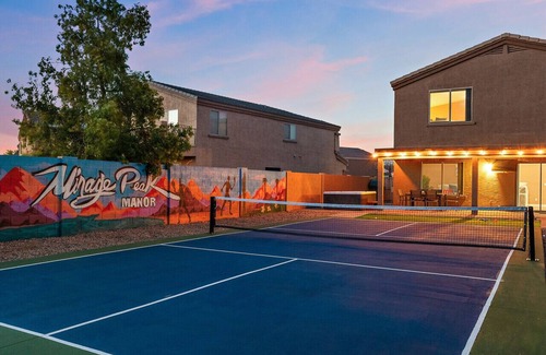 Discover the ultimate in luxury and comfort at Mirage Peak Manor, a stunning 3200 sqft villa in Casa Grande, AZ. With a private pool featuring a waterfall, a state-of-the-art hot tub, and endless amenities—including a brand-new pickleball court and an eye-catching mural—this beautifully decorated villa offers an unforgettable experience for families, groups, and workers. Experience the finest vacation rental in Casa Grande, where elegance, style, and relaxation come together for an exceptional stay.