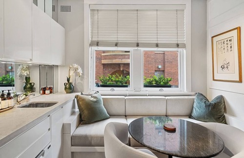 The sleek kitchenette is fully equipped, featuring modern appliances such as a Smeg kettle and toaster, a Dolce & Gabbana blender, a Nespresso machine, an oven, a stove, a mini fridge and a dishwasher. Just beside it, a dining nook with plush bench seating beneath large windows offers a bright and welcoming spot to enjoy a quick breakfast. Freshen up in the compact bathroom, complete with a full bathtub, overhead shower and complimentary toiletries. While there’s no in-unit laundry, a shared rooftop facility with a paid washer and dryer offers added convenience for longer stays.
