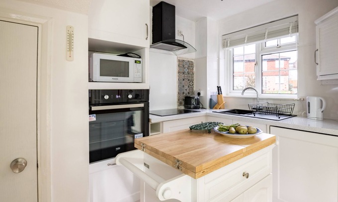 The ground floor includes a bright and airy living room, with comfortable seating, a television and double French doors opening onto a private patio garden – perfect for al fresco dining or evening drinks. There’s also a dedicated dining area and a compact but well-equipped kitchen with modern appliances. (Please note there is no dishwasher.)