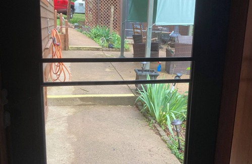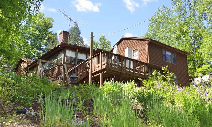 Our three level home has central heat and central air conditioning a master bedroom suite has a king size bed daybed with trundle and bath which are on the top level. The middle level has an antique great room with a dining area sitting area with piano. Between the middle level and lower area there is a full window door which you can close, that way you can relax while the kids watch TV and keep an watchful eye out. The primary level has a family room, kitchen, dining area, 2 bedrooms with 1 queen bed, bathroom with walk in shower with bench, grabs by the toilet is helpful for elderly, 2nd bedroom has full size bed next to a bath There is a full size sofa bed in the family room and the other sofa can sleep one , and we have . wide sidewalk to the patio walk out on the deck to enjoy the view of the river or listen to the night sounds of the whip or will and frogs while enjoying starry nights Also enjoy the beautiful fall foliage. the winter is a wonderland when it snows with ice on the river below and a warm woodstove to snuggle by.