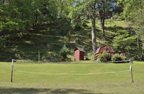 Our play area by the river has a large firepit, tables, extra chairs that you can sit in the river, volleyball net, basketball goal, cornhole game lights for nighttime fun.