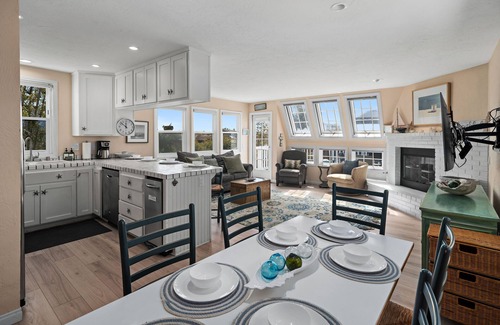 On the ground floor, you'll find two serene bedrooms with en-suite vanity areas, ceiling fans, and direct access to a private patio—ideal for early morning coffee or quiet evening chats. Head to the second floor to enjoy an open-concept living area with a cozy fireplace, a fully equipped kitchen, a dining area, and a sun-drenched patio with bay views and a grill.