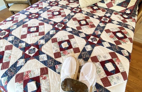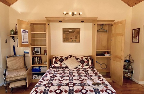 The custom-built queen bed guarantees a quiet, good night's sleep on the softest linens and finest pillows. And when you wake, sit up and stretch, you’ll immediately notice the river flowing from your cozy bed.