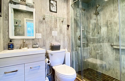 The walk-in shower (complete with a bench) offers a luxurious refresh and Beekman Brothers personal care products.