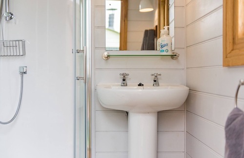 Mist Shepherd's Hut - open plan shepherds hut accommodation with a separate private shower room hut, and outdoor under cover kitchen and washing up area.