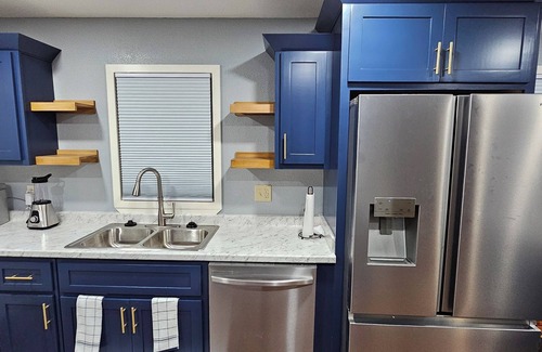 This charming Misty Blue-colored home is a freshly remodeled gem nestled in a peaceful neighborhood near the Great River Medical Center. The soft blue exterior radiates warmth and tranquility, blending beautifully with the serene surroundings. Inside, every detail reflects modern elegance, from the brand-new finishes to the thoughtfully designed layout, making it nice and comfy for its guests. Located in a quiet area, the home offers a calm retreat.