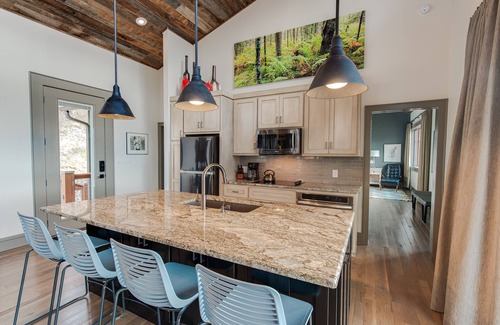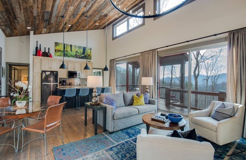 This is a new vacation rental house on gated property in a remote corner of Ashe County, North Carolina. The house was completed in September 2019 and is elegantly furnished inside and out.