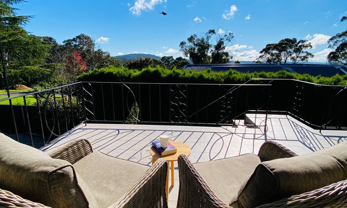 The home is accessed via a flight of stairs that takes you up to the front terrace and front door. The large terrace allows for lounging as you look out to the view of Mount Alexandra and watch the native wildlife (king parrots, rosellas, cockatoos, and kookaburras).