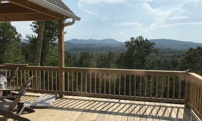 The cabin is 1400 sq/ft with two separate bedrooms and baths. Sleeper sofa pulls out to a full size bed as well as a single sitting chair that pulls out to a single bed. Sleeping 7 total the cabin has everything that your party needs for relaxation in the mountains. Enjoy the expansive deck overlooking the valley or sit by the fire pit for some late night stories amongst the stars.