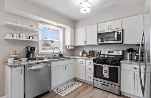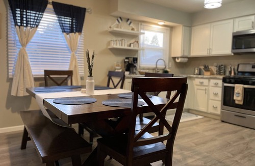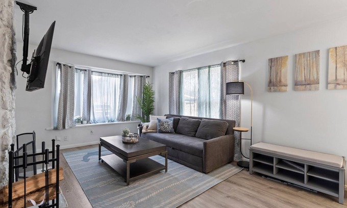 Welcome to our charming 3-bedroom, 1.5-bath townhouse, where comfort and entertainment await you. Upon entering, you'll be greeted by a cozy main floor living room featuring a wood-burning fireplace, a 58-inch smart TV, and a dedicated workspace nestled in a nook next to a picturesque bay window. Relax on the comfortable couch that converts into a queen-sized bed or enjoy some tunes on the record player w/ Bluetooth.