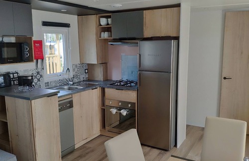 Shower room and separate WC. On the covered terrace, you can enjoy an aperitif or enjoy your grill thanks to the gas griddle. 2 deckchairs are at your disposal to taste the scents of pines. You also have a private parking next to the mobile home.