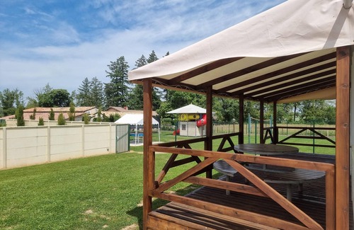 Looking for a simple, comfortable holiday close to nature? Welcome to our 3-bedroom mobile home or our self-contained studio with jacuzzi, located in the heart of the Le Moulin de la Brevette estate, in the Bresse countryside. The 3-bedroom mobile home is ideal for families or friends. A fully-equipped kitchen, cosy living room, modern bathroom and private terrace await you to make the most of the fine weather. On site, you'll enjoy a large wooded park, shaded areas, a heated swimming pool, a children's play area and a peaceful atmosphere. You can explore the surrounding area, or simply relax. The Studio with Jacuzzi offers 60m² with a kitchenette, living room and separate WC. You can also take advantage of all the hotel's services, as with our mobile homes and other rooms. Breakfast and dinner can be served on site for added peace and quiet. Le Moulin de la Brevette offers a warm welcome, personalised advice and a place full of charm where you can take the time to enjoy life. Nearby, you'll discover typical villages and local markets, and the authentic landscapes of Bresse, Tournus, Mâcon and the banks of the Saône are just a few kilometres away.