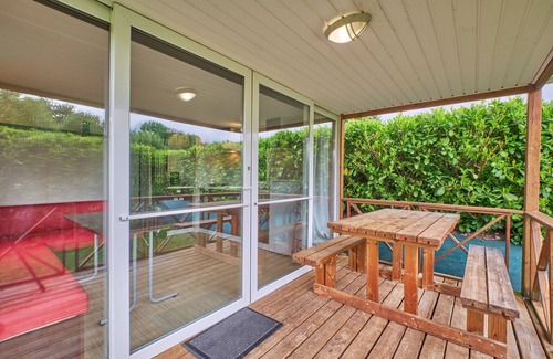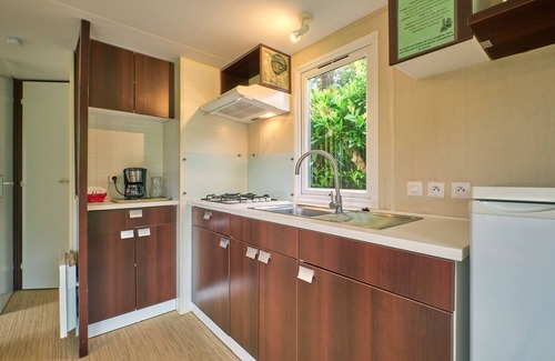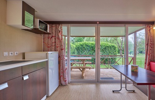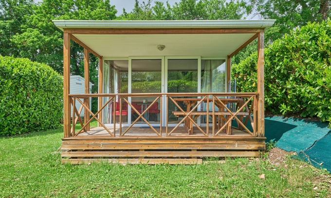 Guests of this mobile home enjoy access to a private covered terrace as well as a range of shared outdoor amenities: a large shared pool (supervised and accessible free of charge), volleyball and petanque courts, a children's playground, barbecues, and a snack bar.