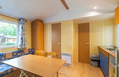 This well-designed family mobile home comfortably accommodates up to 5 guests, offering the perfect balance of countryside charm and modern comfort. Its 3-room layout ensures everyone can enjoy a restful break after a day of outdoor activities and exploration.