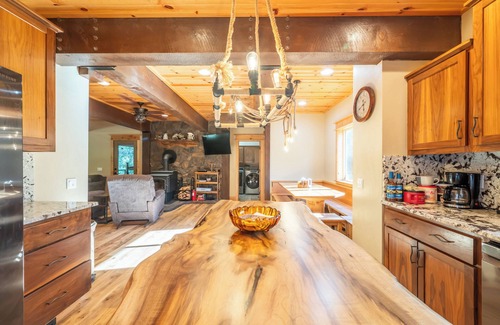 This stunning retreat features a variety of amenities designed for comfort and convenience. Enjoy a spacious layout including a game room, fully-equipped kitchen, and a cozy living area with heated tile floors. For relaxation, unwind in the covered eight-person hot tub located on the southern-style wraparound porch, providing the perfect setting for post-wedding celebrations. With a unique triple-bunk room, free WiFi, and a flatscreen TV, there are plenty of entertaining options for guests of all ages. Plus, it's pet-friendly, so your furry family members can also join in the festivities!