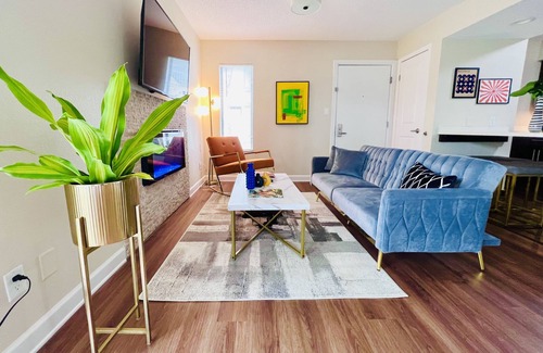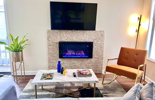 Enjoy a stylish experience at this centrally located apartment. Let your senses be immersed in the artfully decorated studio apartment big on style and comfort. Sprawl out in the king-sized bed with luxurious soft linen to embrace you for a wonderful night's sleep. Wake up to your personal coffee shop with a Keurig and an assortment of hot beverages. Enjoy the vibe in front of the fireplace while relaxing in the living space sipping on your favorite beverage or watching your favorite show.
