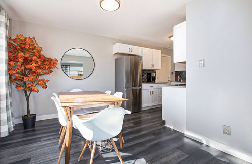 Just off the living room, the kitchen and dining area offer a perfect space for gathering. The dining area is bathed in sunlight thanks to large windows, creating an inviting setting for meals around the natural wood dining table that comfortably seats six. The fully-equipped kitchen has everything you need to prepare delicious meals, including an electric stove, oven, fridge/freezer, microwave, coffee maker, toaster, and dishwasher for easy clean-up. You’ll also find an array of cookware, utensils, glassware, and plates to make mealtime seamless. For added convenience, a washer and dryer set is available to freshen up your wardrobe during your stay.