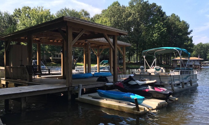 This lake house is ideal for a family of eight, it has three bed rooms, a dining room, family room and a very big nice glass room facing the lake. The master bedroom has one queen bed, the second room has two bunk beds for four, and the third bedroom has one queen bed. The very big sun/glass room facing the lake and it is very ideal for relaxing and away from your work. The boathouse is very nice it has the swing bench, and chairs already to use. Life jackets and a canoe with paddles are available for free to use. The boathouse has both sun and covered decking. The tie up cleats are provided to easily secure your watercraft to the dock. The community boat ramp is 20 ft away from the boathouse and it is very convenient. The kitchen with all necessary tools are available for cooking. Food Lion, ABC, Subways and Ice Cream shop, MorningStar marina are a few miles away.