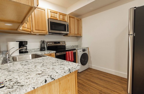 • Full kitchen with granite countertops, stainless steel appliances, and essentials for cooking
