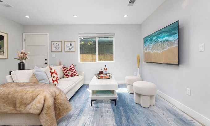 This spacious 2-bedroom, 1-bath unit in Granada Hills offers a perfect blend of comfort and convenience. One of the bedrooms features a luxurious king-size bed, while the second bedroom includes two twin beds that can easily be converted into a king-size. Both bedrooms are equipped with smart TVs, and you’ll also find a large smart TV in the living room for your entertainment.