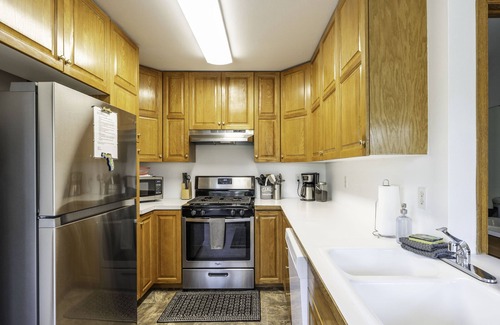 This two story townhome features lots of natural light, galley kitchen, gas stove, modern furnishings, one car attached garage, private patio area and two master bedrooms each with their own bathrooms.