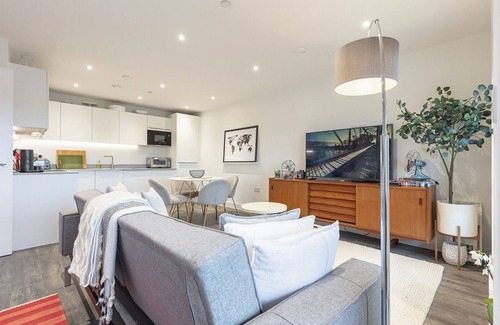 Experience modern comfort in this stylish 2-bedroom, 2-bathroom apartment with a private balcony. Located on the top floor, the spacious 900 sq. ft. home offers free parking and a fully equipped kitchen. Sleeps up to 5 guests (on 1 King, 1 Double and a split-back sofa). Conveniently close to shops, dining, and transport, with express trains to London in 23 minutes. Enjoy a warm welcome!