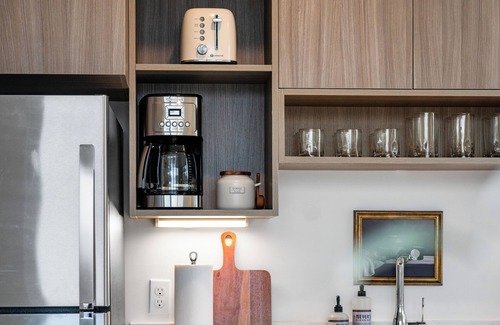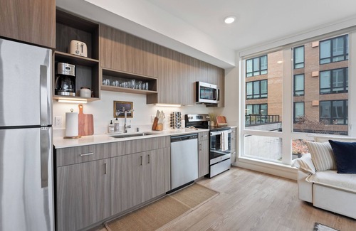 This well-appointed apartment includes a spacious living area with high windows, allowing for plenty of natural light during the day, and darkening blinds to ensure privacy and a restful night's sleep. Modern appliances, such as a dishwasher and in-unit washer and dryer, provide all the comforts of home. The fully stocked coffee bar in the kitchen makes it easy to enjoy your morning routine. For additional relaxation, guests have access to a 24-hour gym and a second-floor lounge with an outdoor patio, featuring seating, an electric fireplace, and a grill perfect for entertaining.