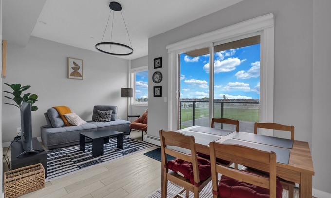 Welcome to your modern 2BR retreat in Calgary’s vibrant West District! This stylish suite features a cozy lounge area, comfy sizable beds, Smart TV, and a fully equipped kitchen. Enjoy scenic views, blazing-fast Telus fibre Wi-Fi, in-suite laundry, and secure underground parking. Steps from trendy cafes, shops, and dining, and just minutes to downtown. Ideal for couples, professionals, or small families seeking comfort and convenience.
