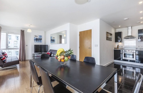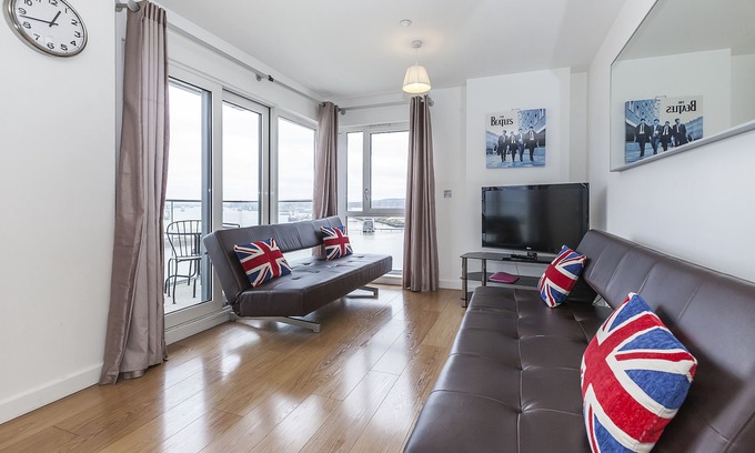 Spacious riverfront apartment in Greenwich Peninsula. Perfect for exploring all London attractions, 15 min by tube to centre, North Greenwich tube station an easy 10 min walk. Ideal for O2 (8 min walk) and Excel. Safe, family friendly, upmarket area.