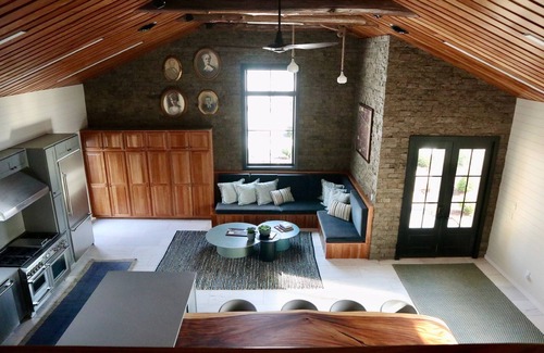 The two-floor farmhouse features three bedrooms and two and one-half bathrooms. Sheets, towels, and basic toiletries are included. The second floor includes: