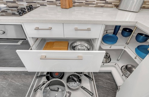 Modern Kitchen: Fully equipped with stainless steel appliances, ample counter space, and all necessary cookware and utensils.