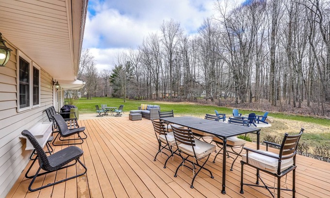 Enjoy dinner on our expansive deck & relaxing around our custom stone firepit listening to owls & watching fireflies. Comprehensive kitchen and cozy spaces in the home to watch TV, work at a desk and rest on quality bedding.