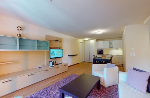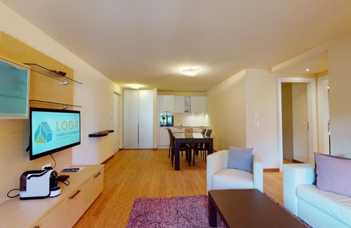 Modern 3½ room apartment on the 1st floor, approx. 63m² in size. Entrance with wardrobe. Open living and dining room with kitchenette. Dining table with four chairs, one sofa, Smart-TV and balcony. Kitchen with cooker, oven, refrigerator and dishwasher. One double room with Smart-TV. One room with a single bed and a loft bed, balcony. Bathroom with tub, sink, toilet and bidet. WLAN. Shared ski and bike room and washing machine in the basement. One parking space in the underground car park (height max. 210 cm).