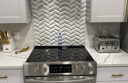 Amenities provided: body wash, shampoo, conditioner towels, tissue, 2 rolls of paper towels, laundry detergent, dishwashing liquid, dishwasher pods, plates, cups, silverware, cooking utensils.