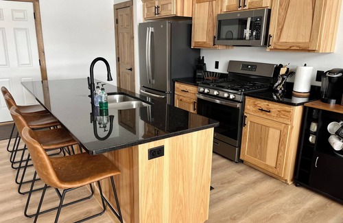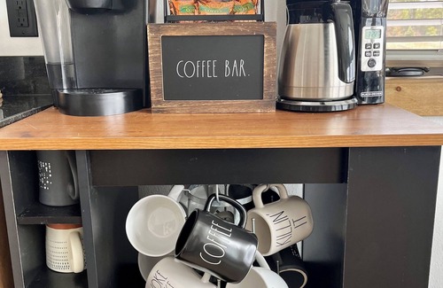 Kitchen - Fully equipped with newer LG appliances including gas range, dishwasher, and large fridge. Large island that seats 4. Coffee bar with drip coffee maker (ground coffee included).