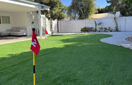 Lovely remodeled single story house with unique style and WI-FI. Master bedroom with King size bed has a French door leads to an expansive/beautiful backyard with 4-holes golf putting. Other three bedrooms also offer king beds, two that feature a desk. Spacious living room (with one sofa/futon bed, 66"x37"), kitchen and dinning/office areas. Large covered patio with outdoor dinning and gym activities. Close to plenty of restaurants and shopping malls. A quick 3-minute drive to the FWY. Great for family vacations, work, or long stays. Our home is close to parks, hiking trials, golf club, and the beach is only a 25 min ride through the canyon to Malibu.