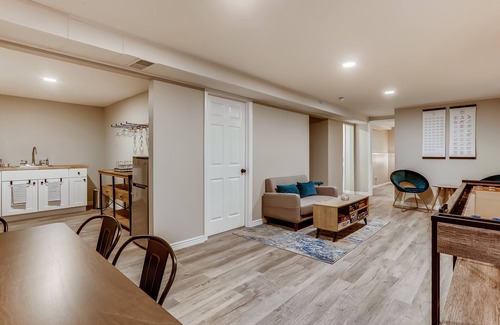 The basement level features a kitchenette, dining area, and plenty of entertainment space, which includes a TV, board games, and a shuffleboard table! You will also find 2 additional bedrooms, 1 shared bathroom with a rain shower, and a laundry room.