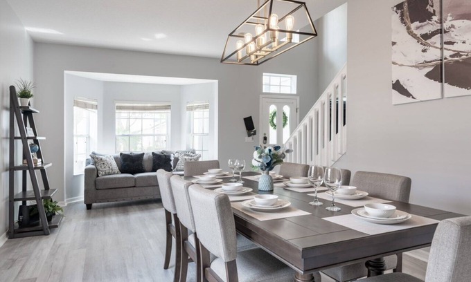 This modern 3,000 sq ft. 5-bedroom, 4-bathroom home, located by the beautiful community of Champions Gate, is perfect for a large family or group traveling to visit Disney and the surrounding theme parks. This spacious home provides a calm cozy setting with a touch of modern comfort. Enjoy the elegant dining room and kitchen fully equipped with brand new appliances suited for cooking. This modern inspired home also has a private pool with the option of heating, as well as a game room both children and adults can enjoy. Guests will also have central air conditioning all throughout the house and the benefit of having a laundry machine and dryer inside the home. The house is also very conveniently located just a short drive to major superstores such as Publix, Target, Walmart, grocery stores, restaurants, bars, cafes, shopping centers, and outlet malls. Let this be your peaceful home-away-from-home with an awesome pool all surrounded by Florida’s beauty and breathtaking views.