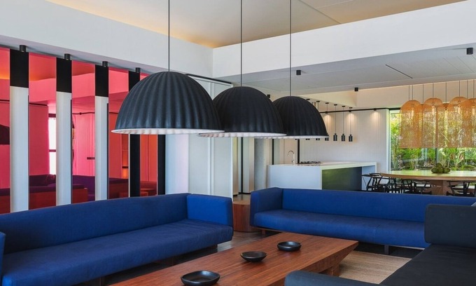 With large windows opening onto the terrace and the ocean, the air-conditioned and cozy living space features long benches with blue and wood hints under beautiful hanging lights. It offers three large comfortable and stylish sofas, just perfect for bonding over your favorite movies. The sophisticated decor of the space is minimalist and perfect for entertainment.