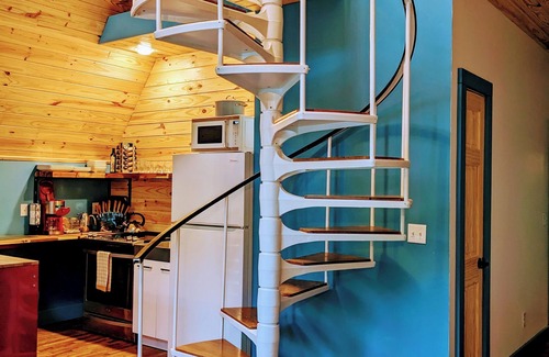 Pinnacle, entirely your own to enjoy, comfortably hosts a family of four or two couples complete with two bedrooms. The main floor bedroom has a king-size bed and a skylight so you can view the forest canopy above. The second bedroom with another king-size bed is located in the open loft with incredible views of our property and a screen divider in case you’d prefer some privacy. The bathroom at Pinnacle is outfitted with beautiful tiles and a gorgeous walk-in shower. The living room is complete with a smart TV, a mid-century modern sofa and slipper chair. The open concept dining area has seating for six where you can look out over the property through our GIANT sliding glass doors. The kitchen is small but mighty! Every amenity has been provided in the kitchen to accommodate all of your culinary needs. All just steps from your own fire pit, we have a spacious deck outfitted with four Adirondack chairs for your relaxation, a brand new gas grill and cornhole boards.