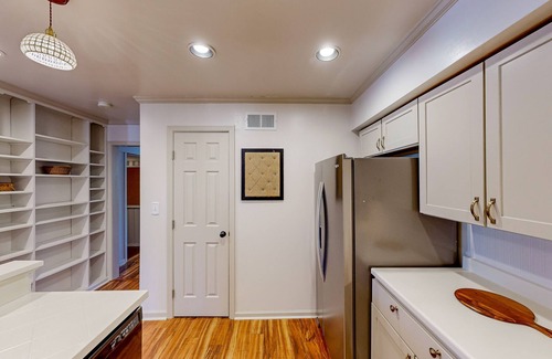 Freshly updated and surrounded by warm wood finishes, the interior of The Lakeway House boasts a homey open layout. The living room's ample seating and smart TV lend themselves to movie viewings, and a game collection is available for board game nights. Well-equipped with stainless steel appliances and ample meal prep space, the kitchen offers a clean area to show off your culinary skills. When you are ready to dine, gather around the circular, velvet sofa and indulge in playful conversation and delicious dishes.