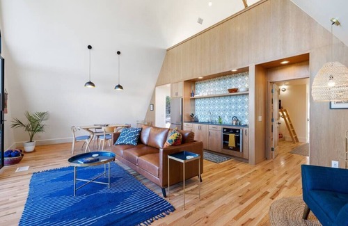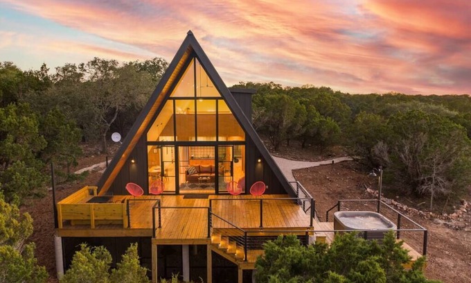 Perched high on a hill overlooking the gorgeous TX Hill Country sits the most stunning A-frame you ever did see. With a mix of mid-century style and artsy touches, this space is gorgeous. The cabin is tucked into a pocket of nature surrounded by 3 acres of oaks, elms, and junipers. The expansive front windows and raised deck provide and incredible sunset view across the hills and dark sky lighting sets the stage for breathtaking starry skies. The hot tub and outdoor shower is the icing on the cake!