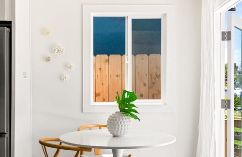 Just a short walk away from the sparkling waters of San Diego Bay and Pacific Beach, this cozy abode is ideally situated for beach lovers and outdoor enthusiasts. Take a leisurely stroll along the boardwalk, explore the nearby shops and restaurants, or soak up the sun on the sandy shores. Step inside to discover a comfortable living space complete with a flat-screen TV, ideal for movie nights or catching up on your favorite shows. Sink into the plush couch and enjoy the breeze from the coastal air or turn on the mini-split AC unit to ensure your comfort during the summer months. The adjacent kitchen is equipped with stainless steel appliances and a bistro dining table for 2, perfect for whipping up casual meals or sipping your morning cup of coffee before heading out to explore. Retreat to the peaceful bedroom featuring a king-sized bed, ceiling fan, and soft natural light. The en-suite bathroom has a sleek shower, ensuring you feel refreshed after a day of adventures. Plus, take advantage of the stacked washer and dryer for added convenience during your stay. Relax and unwind in the quaint, outdoor oasis of this special home. The front patio welcomes you with a dining table for 4, perfect for al fresco dining year round. Fire up the BBQ grill for a cookout, gather around the fire pit with 4 chairs for idyllic evenings under the stars, or enjoy some downtime in the small grassy area. You can easily explore the scenic surroundings of the area on foot or rent a classic beach cruiser!