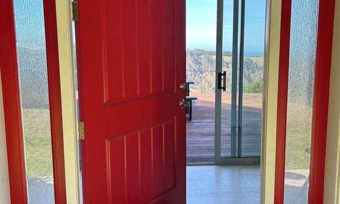 Twenty-five minutes from downtown Mendocino, on the crest of Middle Ridge, you'll enjoy 30 acres of total privacy overlooking the valley to the ocean below: This is a new listing for our gently used second home, with a modern design framing sweeping views from every room. There are 2 bedrooms and 2 private half baths with a large walk-in conjoined shower. As we often have guests, we have purchased the most comfortable of solid foam American Leather couches, which fold out in the second bedroom and living room for a total of 6 people. (an additional floor futon is available for a little one ).