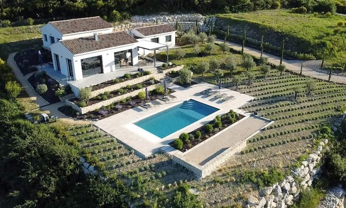 This new, modern and luxurious villa classified with 5 stars (with heated pool, and magnificient valley views alle the way to the Drôme and the Mont Ventoux) is located alongside the Route Touristique des Côtes du Rhône at the border of the charming village of Villedieu.