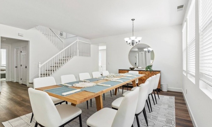 Elegant Dining Room: Host your meals in a bright and inviting dining area with a large table that seats everyone comfortably.
