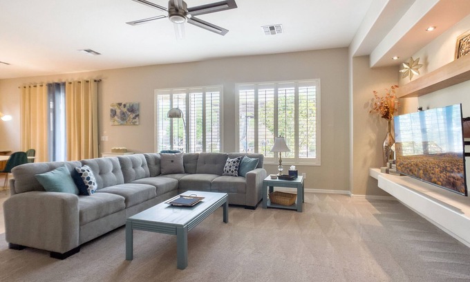 This pristine three-bedroom, two-bathroom home offers all the amenities for a perfect vacation getaway or suits as a home away from home. Step into our modern home with a seamless blend of indoor and outdoor spaces. The open floor plan, high ceilings, and well-equipped kitchen create a luxurious experience. Unwind on the spacious living room couch or enjoy the private backyard with an outdoor dining area, grill, and comfy seating options. Relax in the hammock, shaded by retractable sun shades during the day and illuminated by Edison-style bulbs in the evening—a serene outdoor living space perfect for soaking in the Anthem, Arizona sunshine.