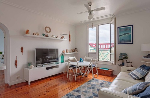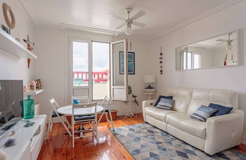 This apartment with careful decoration consists of a living room giving access to a balcony (be careful of the small step to access it) with a view of the sea and the large beach of Hendaye and a semi-open kitchen perfectly equipped.