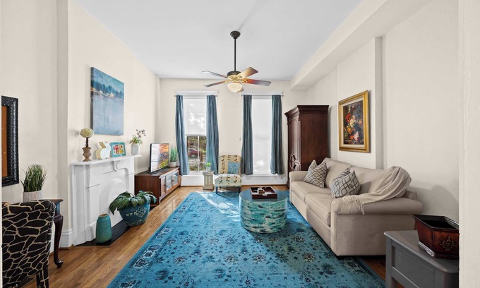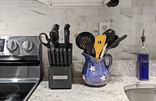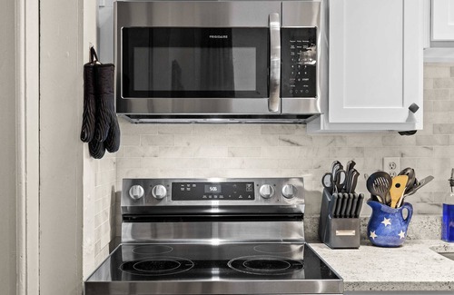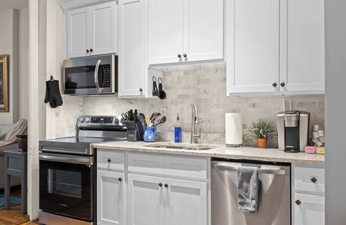 Step into our beautifully updated apartment in the heart of Louisville. This cozy one-bedroom, one-bath retreat features a stylish mix of modern comforts and historic charm. Relax in the family room with a smart TV, cook in the fully equipped kitchen with dining for four, and unwind in the black-and-white artistic bathroom. Enjoy free street & on-site parking, self-check-in, and fast WiFi—all just minutes from Churchill Downs, Nulu, and downtown!